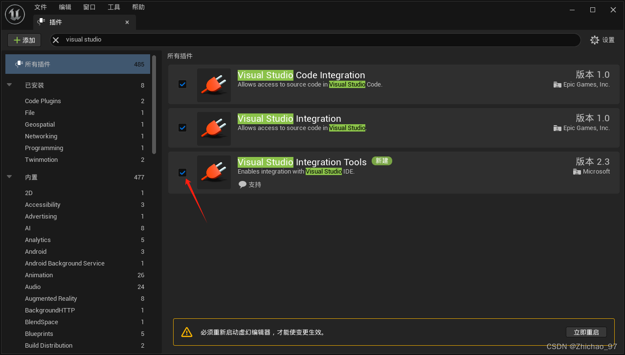 在虚幻编辑器中的插件中搜索“Visual Studio Integration Tool”并勾选