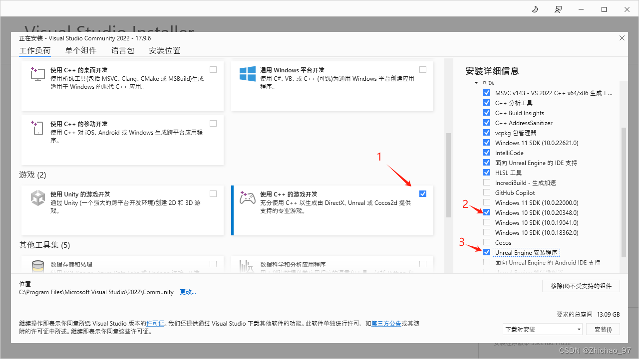 2. 在安装程序的“工作负荷”面板,先勾选“使用C++”的游戏开发,然后勾选“Windows 10 SDK”和“Unreal Engine 安装程序”