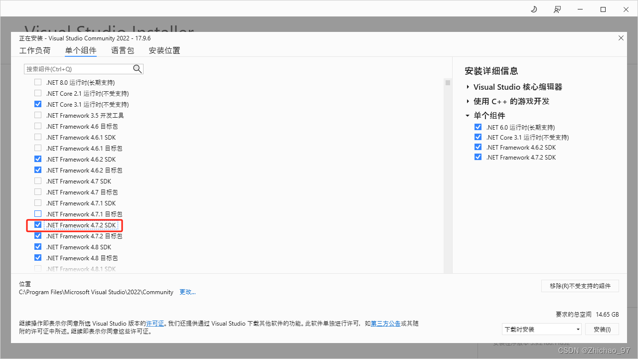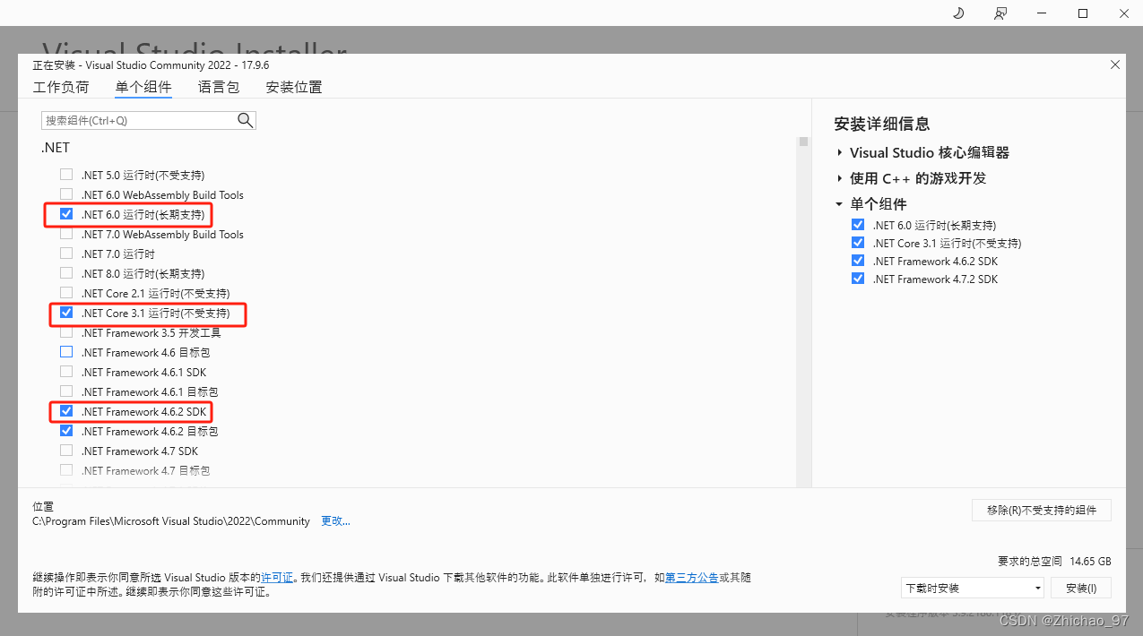 在安装程序的“单个组件”面板,保证如下选项已被勾选: