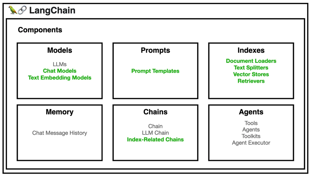 4. 索引(indexes) : 索引是连接知识与 LLM 的关键,可构建属于企业、场景、用户个人的专属知识库。主要包括文档加载、分割、向量化、检索,链中使用索引的常见方式是 “检索”,如 RAG 一般都会经过 “检索” 步骤,以获取与用户问题最接近的可靠知识信息。