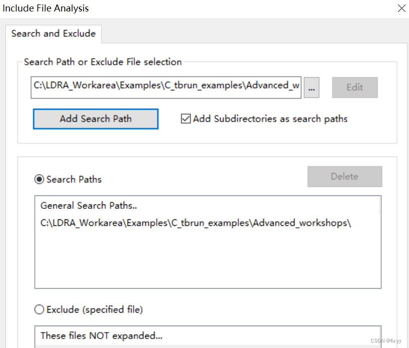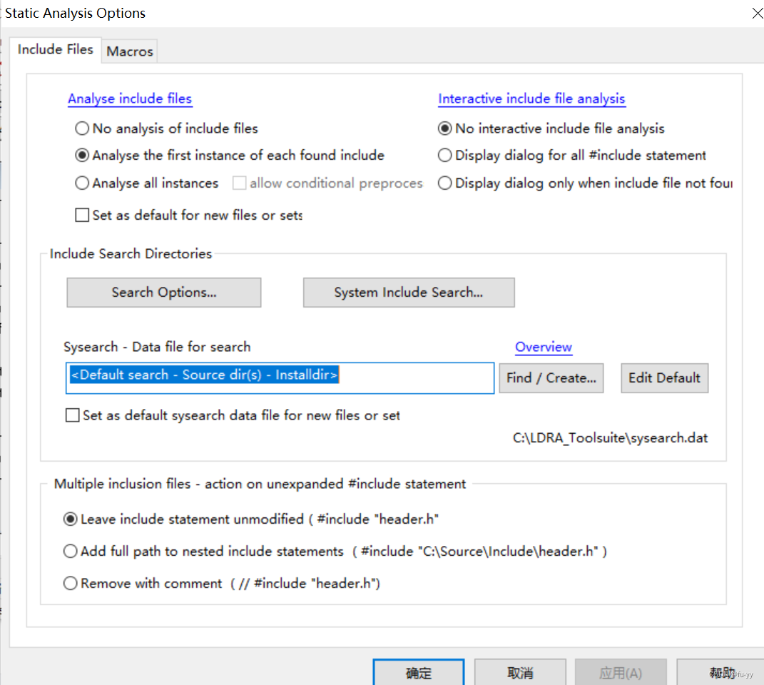 include search directories区域设置头文件的查找目录和系统头文件的处理方式,其中search options设置头文件的查找目录,分析前须添加头文件目录,system include search设置系统头文件的展开方式,建议设为don’t expand