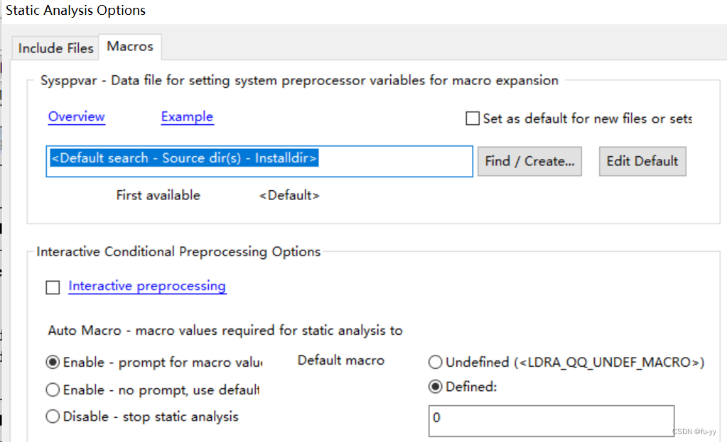 interactive conditional preprocessing options区域设置针对代码中未识别的宏的处理及交互方式,选中interactive preprocessing时,出现未识别的宏时会弹出对话框让用户定义此宏,AutoMacro设定宏的自动定义处理方式: