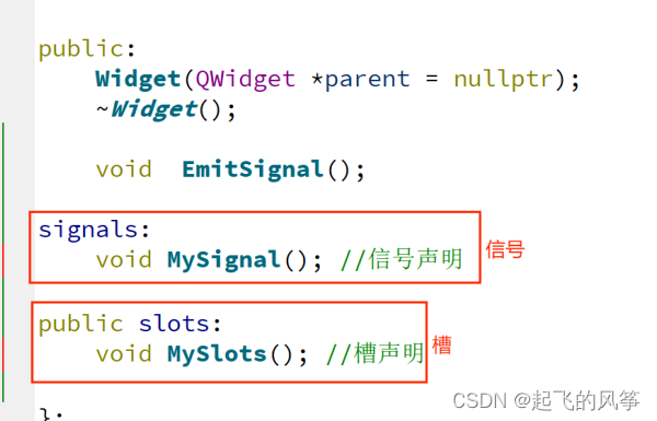 - 自定义的信号函数和槽函数应该遵循一定的书写规范,例如在类的声明部分中使用