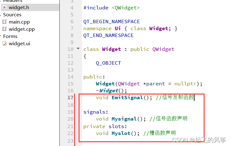 1、在"widget.h"中声明信号和槽以及信号发射函数;
