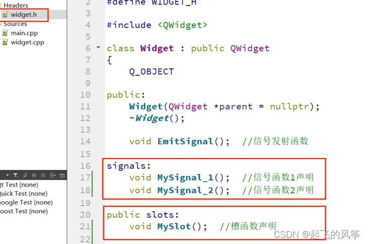 - 信号函数用signals关键字修饰,槽函数用public slots、protected slots或private slots修饰。signals和slots是Qt在C++基础上扩展的关键字,专门用于指明信号函数和槽函数;