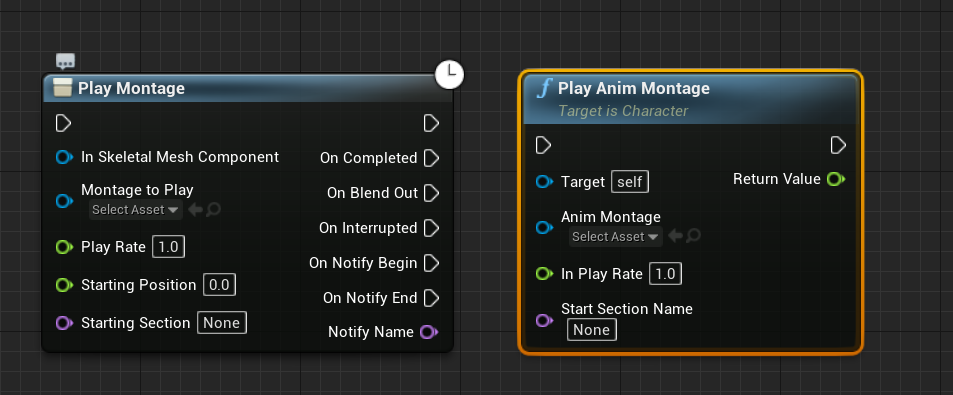 在蓝图中播放蒙太奇动画,可以使用 PlayAnimMontage 和 PlayMontage,并且PlayMontage可以在,蒙太奇动画播放完的时候执行想要执行的程序