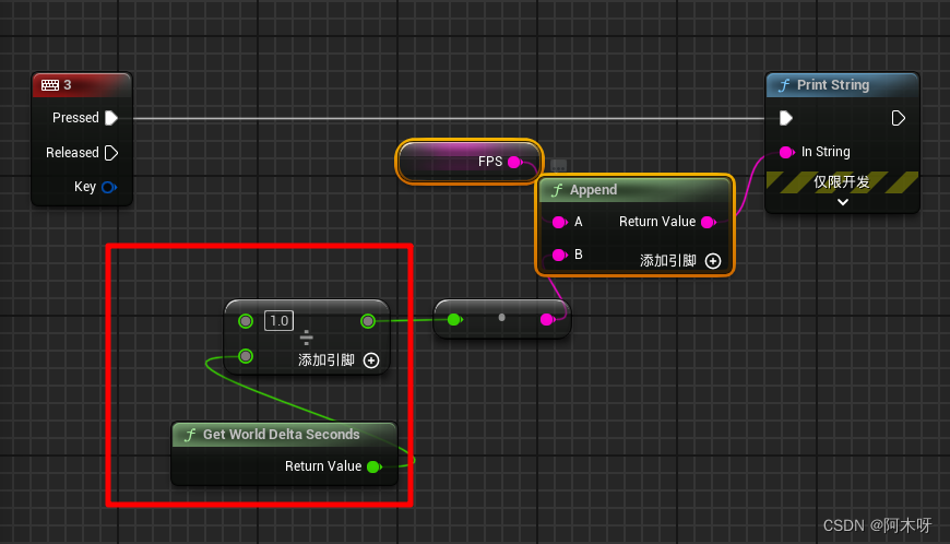 下图的节点逻辑中,我通过按下数字键3,来向屏幕打印计算所得的FPS。(Appen节点是字符串组合节点,类似C++中对字符串的“+”重载)
