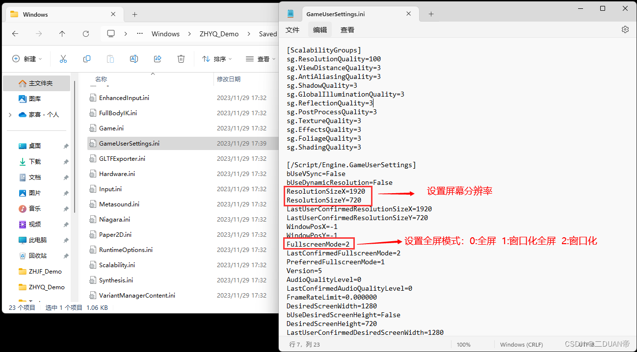 注:图中的FullscreenMode 其中:0=窗口化,1=无边框窗口,2=独占全屏