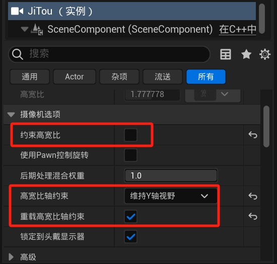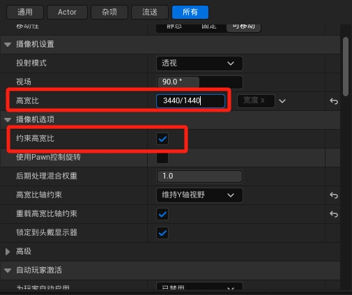 主要问题是当前摄像头约束了比例,需要将需要设置的“摄像头选项”去除“约束高宽比”,如果项目是第一人称视角的,再选中“重载高宽比轴约束”,并将高宽比轴约束选为“维持Y轴视野”。