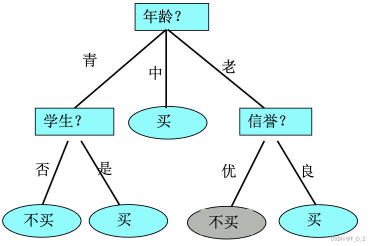 分类决策树是一种描述对实例进行分类的树形结构,决策树由结点和有向边构成,结点可分为内部结点和叶结点两种,内部节点表示一个特征或属性,叶节点表示一个分类,通常用圆表示内部结点,用方框表示叶结点。
