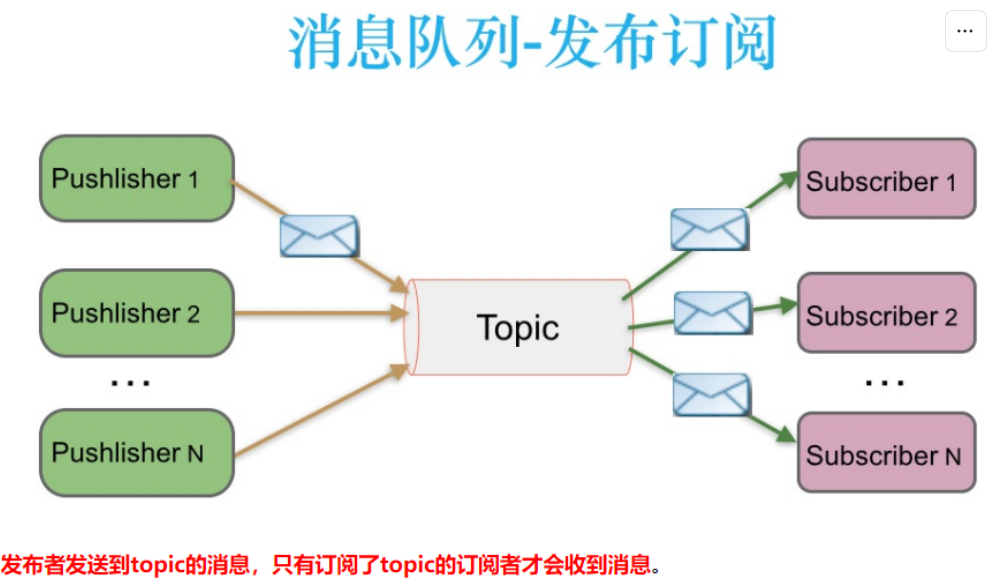 在该模式中,消息呗持久化到一个 topic 中。与点对点消息系统不同的是,消费者可以订阅一个或者多个 topic,消费者可以消费 topic 中所有的数据,同一条数据可以被多个消费者消费,数据被消费后不会立马删除。在该模式下,消息的生产者称为发布者,消费者称为订阅这,架构示意图如下: