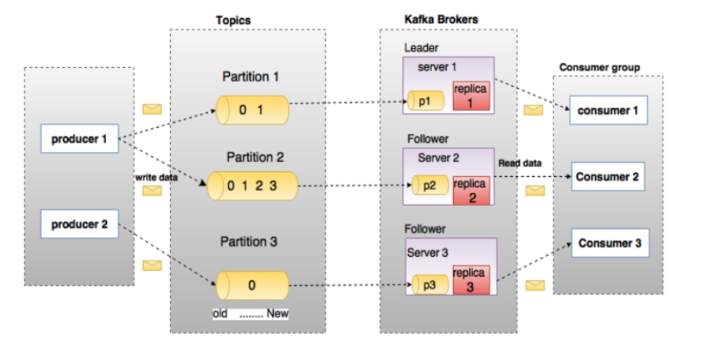 如果一个 topic 的副本数为 3 ,那么 Kafka 将在集群中为每个 partition 创建 3 个相同的副本。集群中的每个 broker存储一个或多个partition 。多个 producer 和 consumer 可同时生产和消费数据。