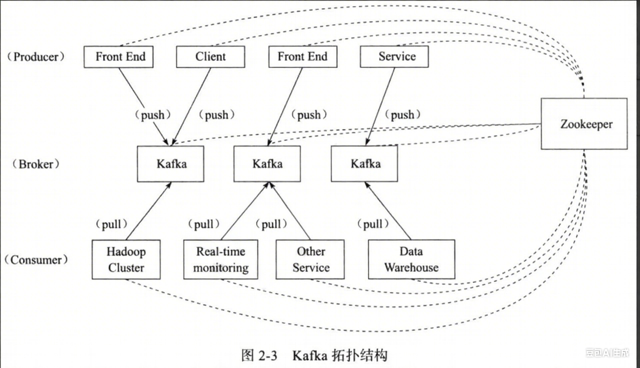 一个典型的 Kafka 集群中包含若干个 Producer( 可以是某个模块下发的 Command, 或者是 Web 前端产生的 PageView,或者是服务器日志,系统 CPU,Memor 等 ) ,若干个 Broker ( Kafka 集群支持水平扩展,一般 Broker数量越多,整个Kafka 集群的吞吐率也就越高),若干个 ConsumerGroup, 以及一个 Zookeeper 集群。 Kafka 通过zookeeper 管理集群配置。 Producer 使用 Push 模式将消息发不到 Broker 上, consumer 使用 Pull 模式从Broker上订阅并消费消息。