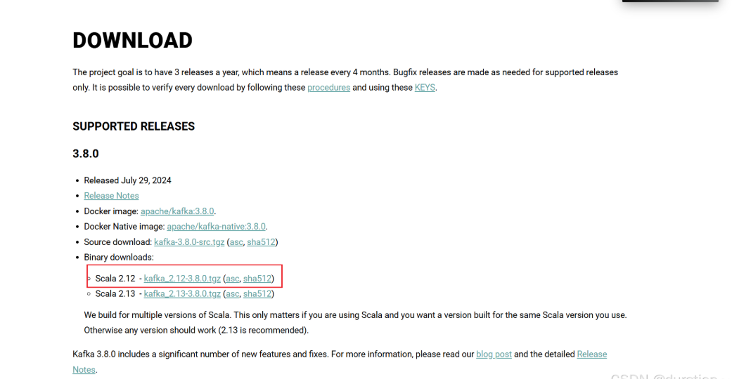 选择 kafka_2.12-3.8.0.tgz 进行下载,Scala 2.12 和 Scala 2.13 主要是使用Scala编译的版本不同,两者皆可