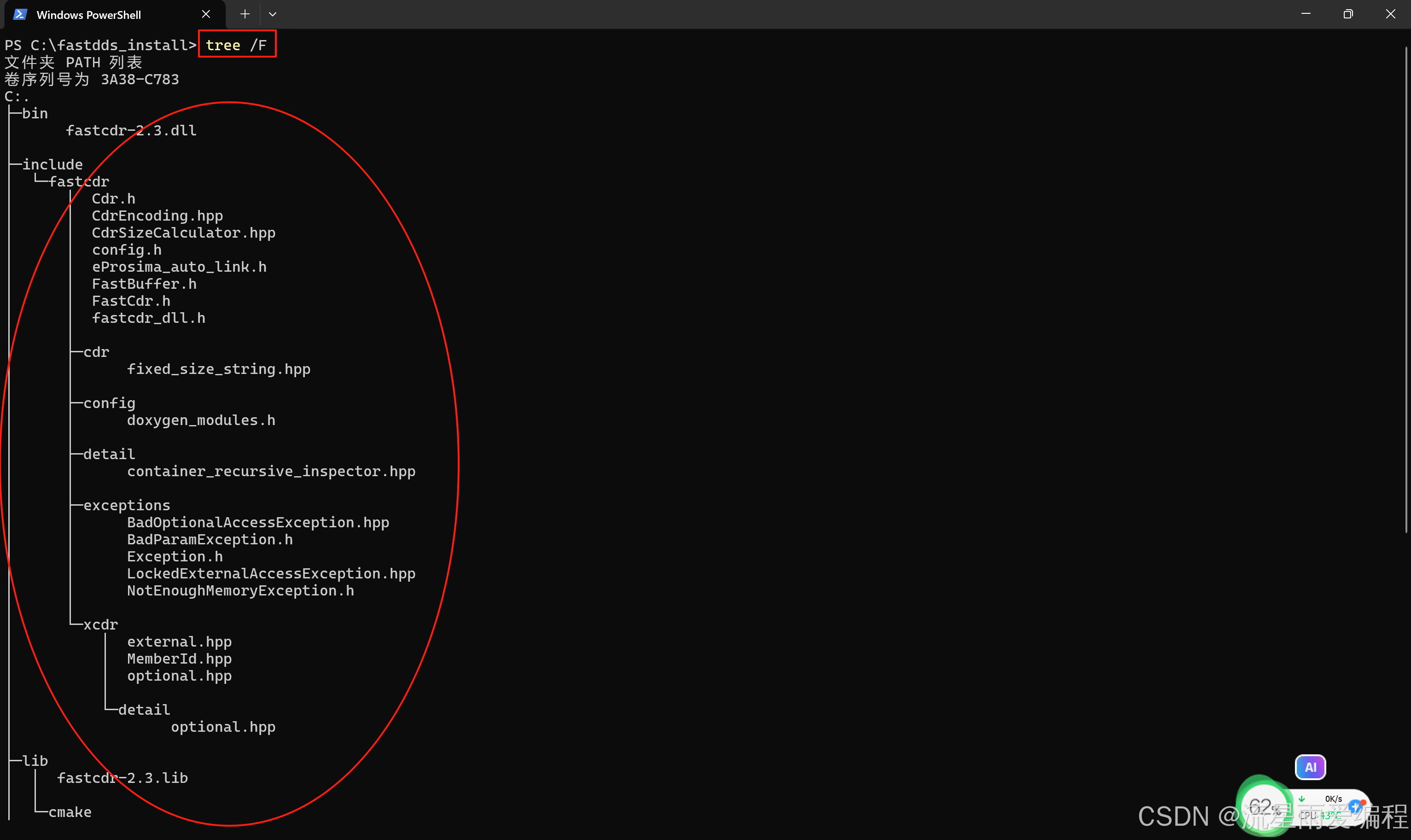 安装完成后,在C:\fastdds_install目录有FastCDR的头文件,库文件等信息: