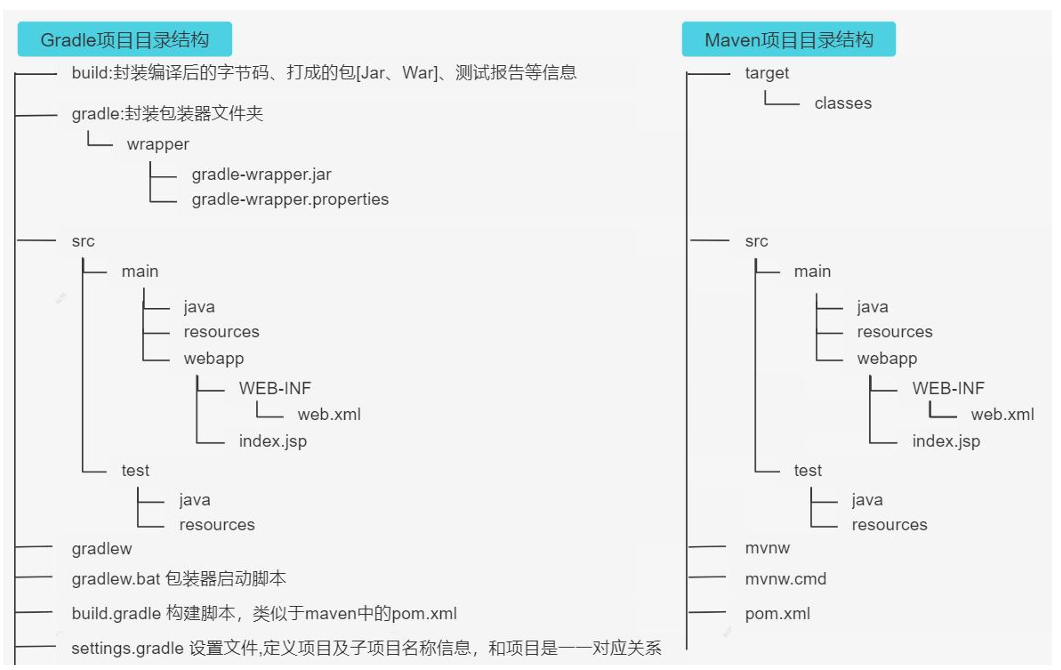 - Gradle 项目默认目录结构和Maven项目的目录结构一致,都是基于约定大于配置【ConventionOverConfiguration】。
