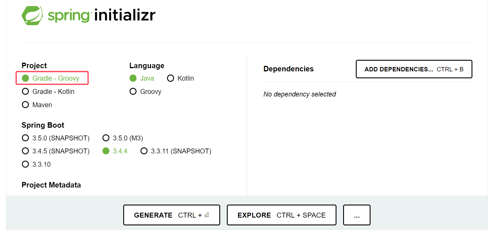 - 借助于spring脚手架创建gradle第一个项目:https://start.spring.io