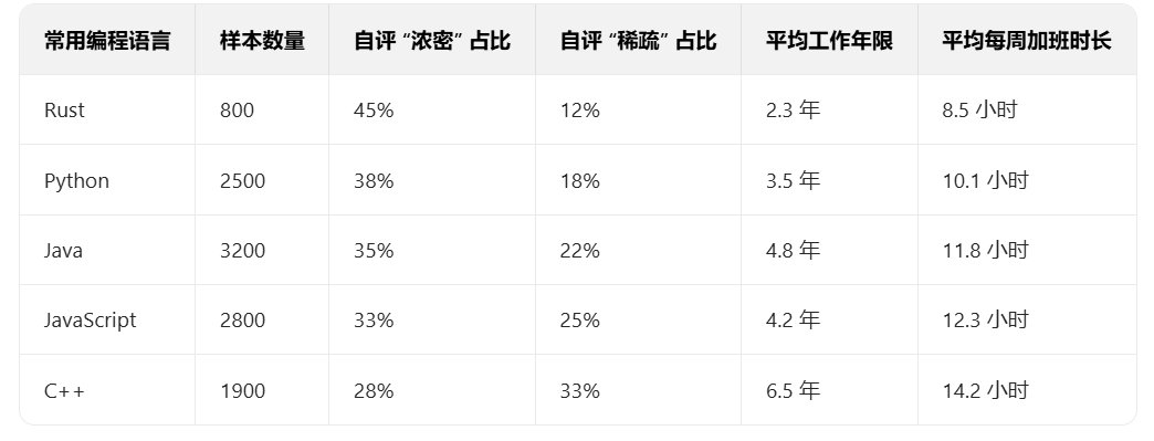 不同语言对应的开发领域,压力强度差异显著。C++ 开发者多从事底层架构、高性能计算,项目周期长(平均 6-12 个月)、复杂度高、容错率低 —— 调研显示,C++ 开发者每周加班 14.2 小时,项目上线前甚至达 20 小时 / 周;而 Rust 开发者集中在区块链、云原生等新兴领域,项目周期灵活(平均 3-6 个月),每周加班仅 8.5 小时,显著低于 C++。