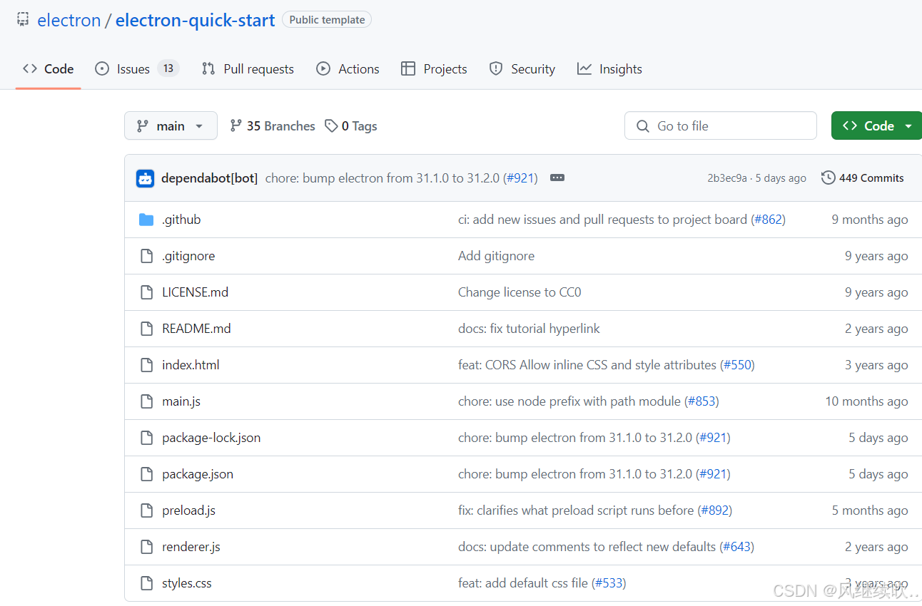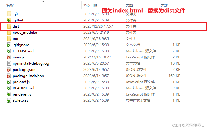 删除 electron-quick-start 文件中的index.html,把vue项目打包的dist文件放进去。