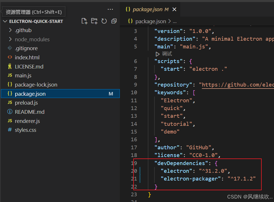 在 electron-quick-start 项目 package.json 配置文件中,scripts 下添加 packager 指令