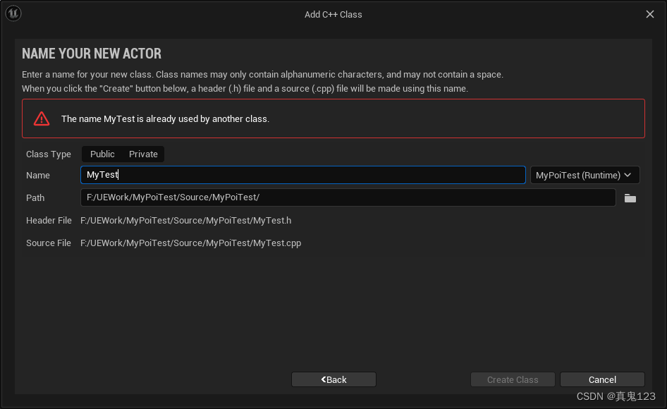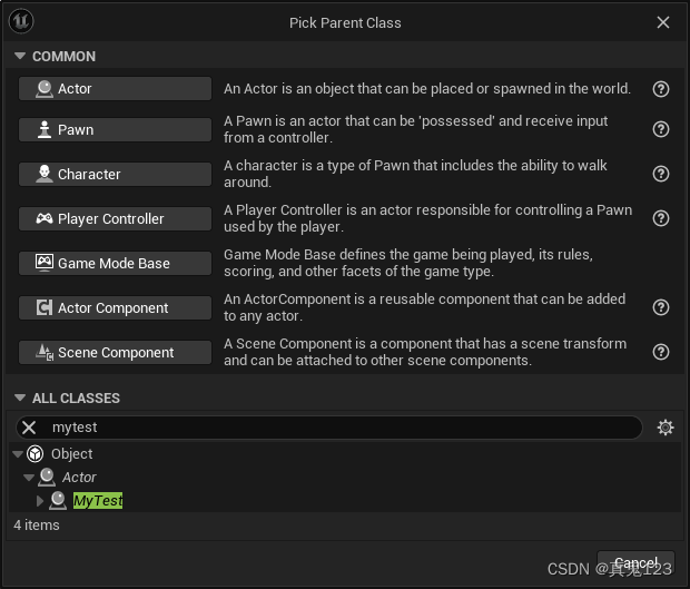 此方法为:先创建C++类MyTest,再以MyTest类为父类创建蓝图;在其他类中,可以通过MyTest调用蓝图对应方法。