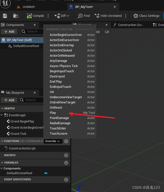 打开蓝图类,鼠标移动到左侧FUNCTIONS菜单上,可以出现下拉菜单,可以发现刚才出现了刚才定义的Play。