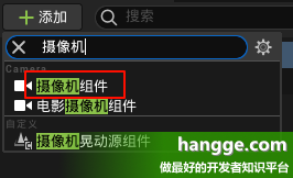 (2)双击打开"BP_CameraComponent" 蓝图,在“组件” 面板中单击“添加”按钮添加一个摄像机组件。若视口中出现摄像机模型,则代表加成功。