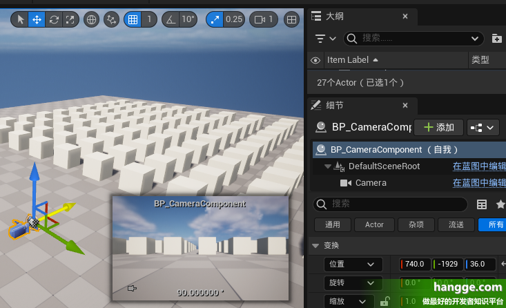 (3)编译并保存后回到关卡中、从“内容浏览器”面板中拖曳 BP_CameraComponent 蓝图到关卡中,选择蓝图后,视口右下角会出现摄像机的视角。