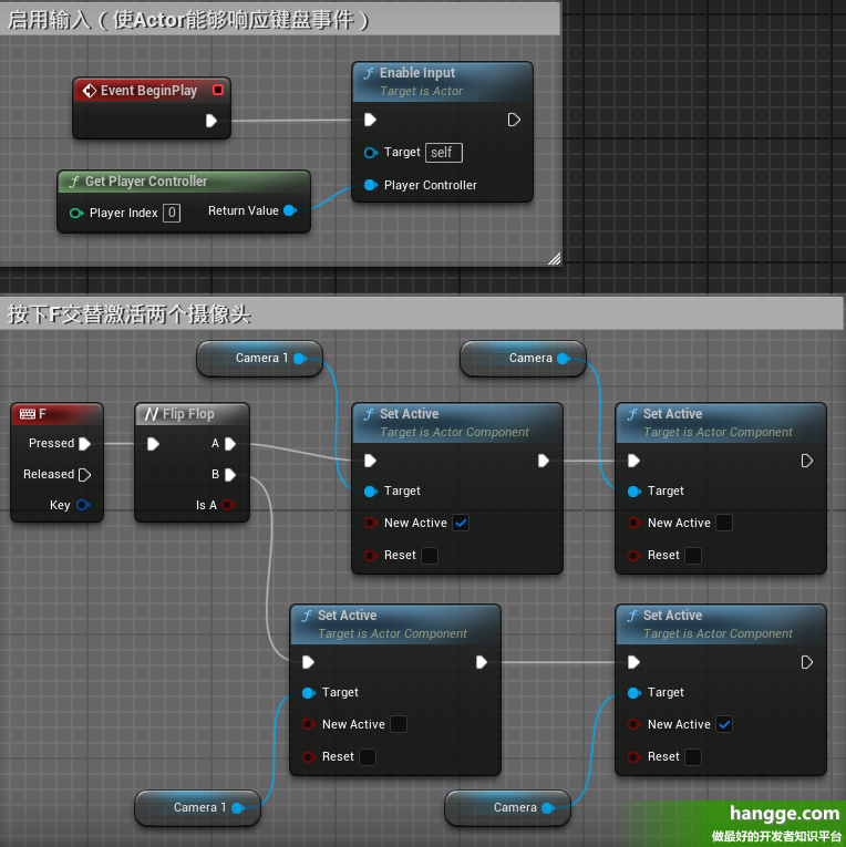 (1)打开“BP_CameraComponent”蓝图的事件图表,添加如下逻辑,实现按下 F 键时可以交替激活两个摄像机。