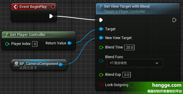(2)打开关卡蓝图,添加如下逻辑。其作用是在游戏开始时,将玩家的视角切换到指定的摄像机组件(BP_CameraComponent)上。