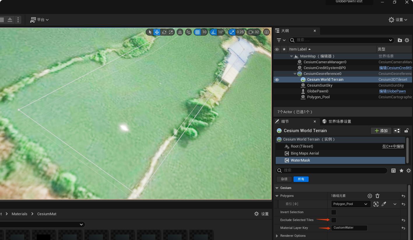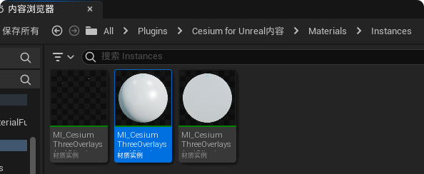 1. 在“All-》Plugins-》Cesium for Unreal内容-》Materials-》Instances”找到“MI_CesiumThreeOverlaysAndClippingAndWater”