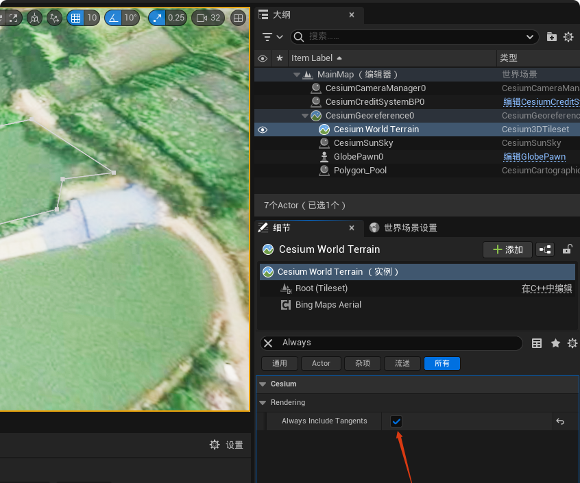 5. 选中“Cesium World Terrain”,在细节面板中勾选“Always Include Tangents”,因为水渲染需要地形上有切线数据。