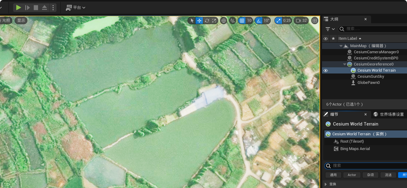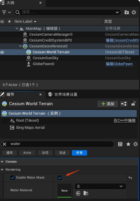 选中“Cesium World Terrain”,在细节面板中搜索“water”,然后勾选“Enable Water Mask”
