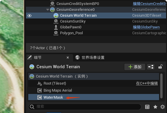 对“Cesium World Terrain”添加一个“CesiumPolygonRasterOverlay”组件,这里重命名为“WaterMask”