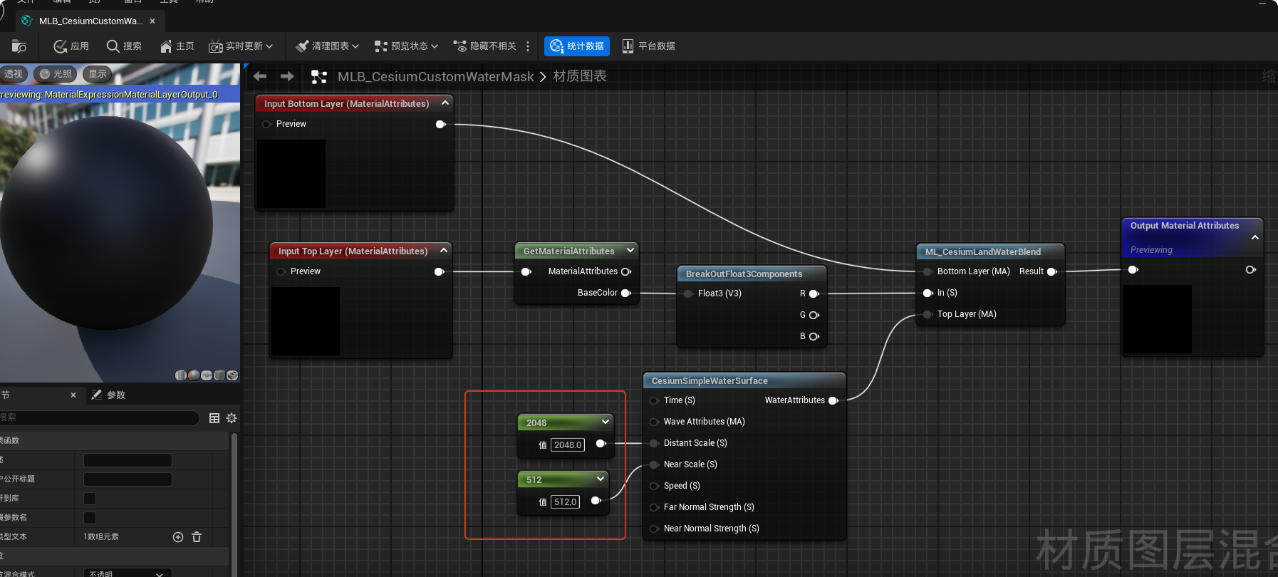 打开“MLB_CesiumCustomWaterMask”,添加如下两个常量节点来设置“CesiumSimpleWaterSurface”中的“DistanceScale”参数为2048,“Near Scale”参数为512。通过设置这两个值使得水面波纹和海浪的较小,从而近似于池塘的效果。