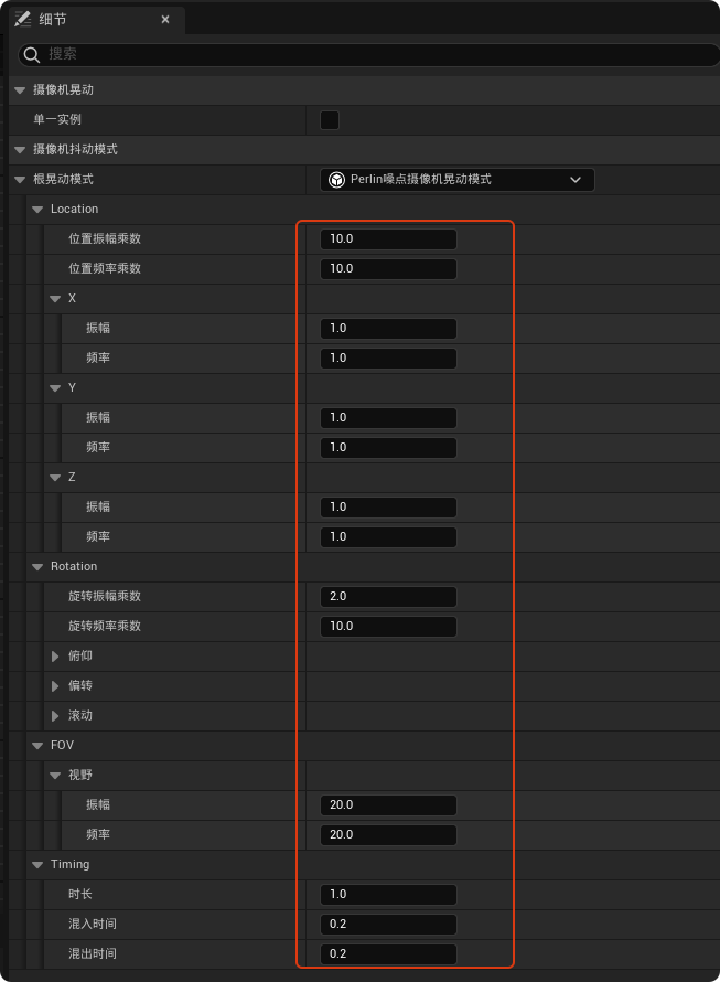 打开“BP_MyCameraShake”,根晃动模式这里设置为“Perlin噪点摄像机晃动模式”
