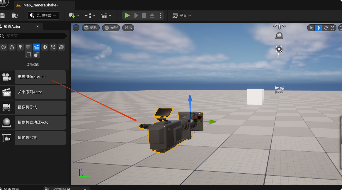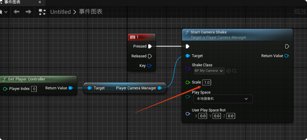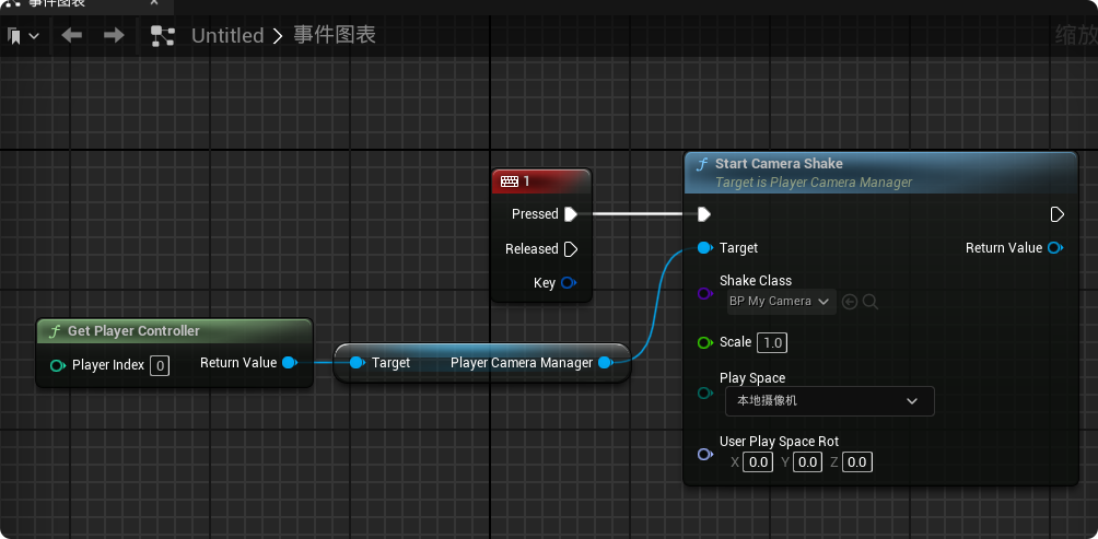 2. 这里在关卡蓝图中通过“Start Camera Shake”节点去调用