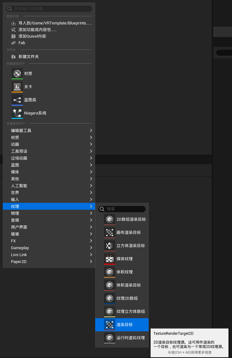 在内容浏览器中右键 → Textures → Render Target,命名如RT_PiP。