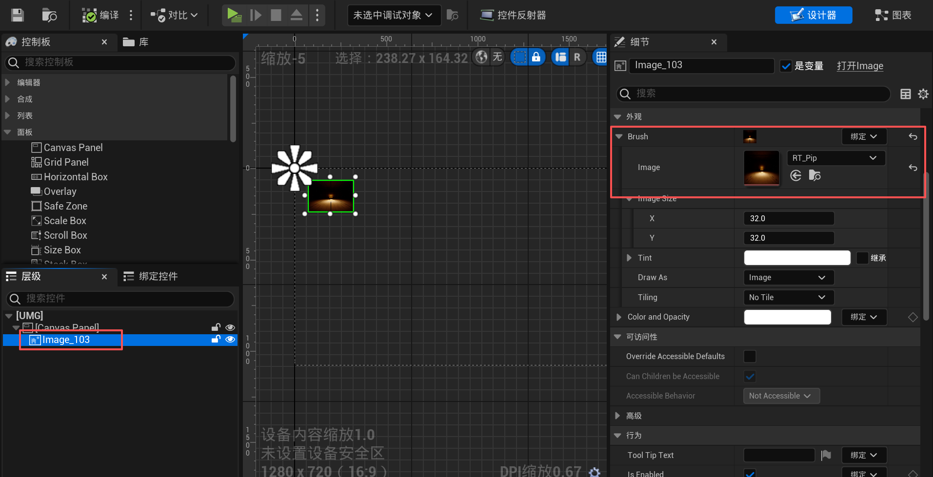 在画布面板中添加Image控件,在Image的Brush属性中,将Texture设置为RT_PiP。