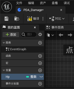 3.创建一个名为PDA_Damage的数据资产实例类,并且双击打开,并在变量中添加“Hp”的整数变量(根据业务添加),编译保存。