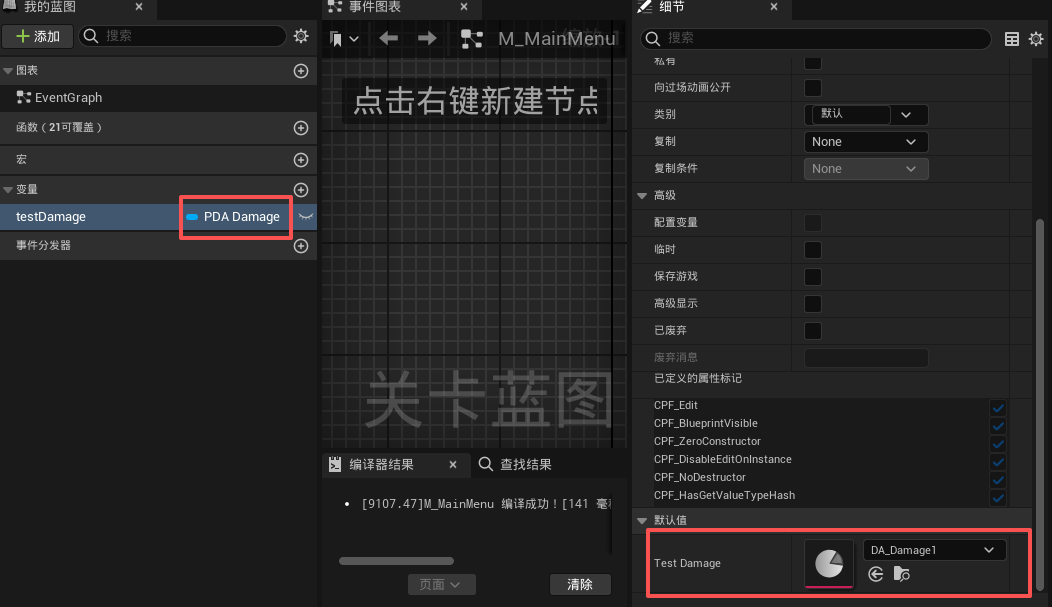 如何使用呢?需要在你使用变量类型设置为PDA_Damage类型,并将默认值选为DA_Damage1,如下: