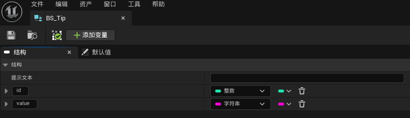 在蓝图中创建变量,变量类型为Data Table,默认值选为数据表格DT_Tip