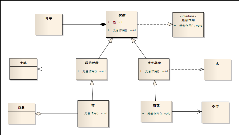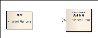 箭线:用空心三角形+虚线表示,箭头指向接口。