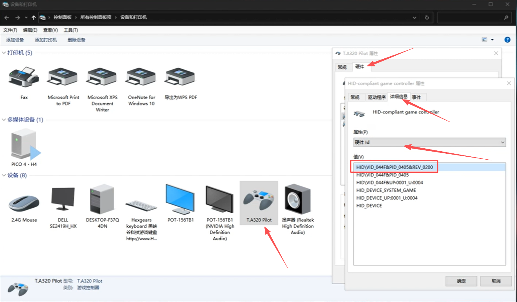 每个设备(比如操纵杆或油门)需要通过供应商ID和产品ID标识,这些ID是十六进制值,位于设备的驱动程序属性中。