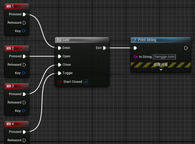 (3)下面时另一个 Gate 节点使用样例,当角色与特殊 Actor(毒气)重叠时,Gate 节点保持打开状态,并且每隔一秒对角色施加伤害。如果角色停止重叠,Gate 节点将关闭,且不再对角色施加伤害。