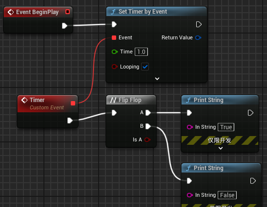 下面样例中“以事件设置定时器”节点会让蓝图每秒执行一次自定义事件。“Flip Flop”节点会让蓝图在第一个一秒输出“True”,第二个一秒输出“False”,如此反复。