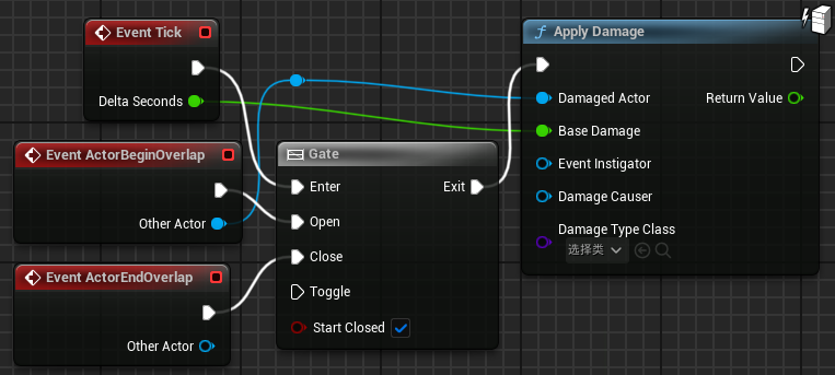 - 持续伤害:当角色与特殊 Actor(毒气)重叠时,Gate 节点保持打开状态,并且每隔一秒对角色施加伤害。如果角色停止重叠,Gate 节点将关闭,且不再对角色施加伤害。